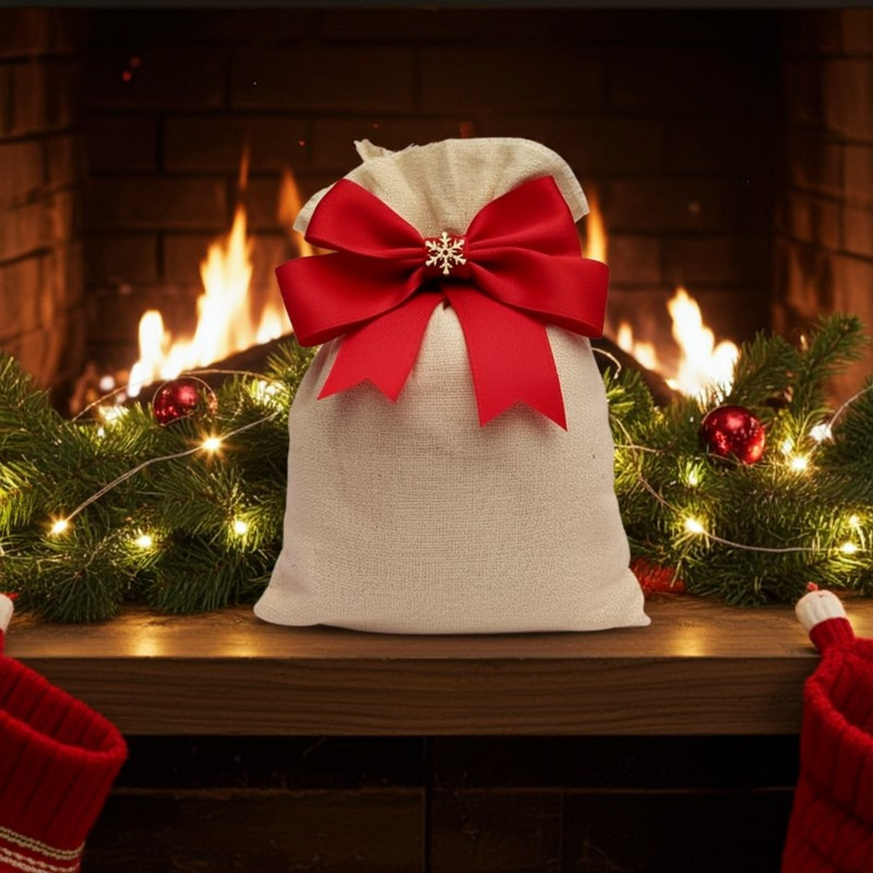 Подаруйте святковий настрій разом із нашим новорічним мішком для подарунків! Мішечок виготовлений із натуральної хлопкової тканини, прикрашений яскравим червоним бантом зі сніжинкою – ідеальний варіант для естетичного пакування подарунків.
